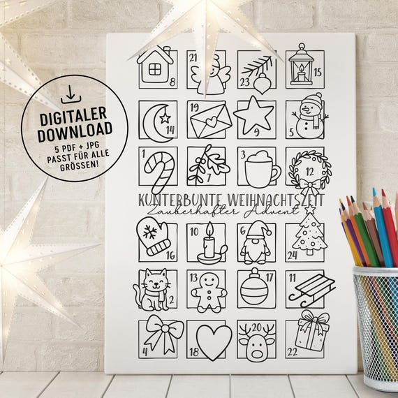 Adventskalender zum Ausmalen für Kinder, liebevolles Weihnachtsbild als Poster mit Malvorlagen für Zuhause, Kita oder Grundschule | Download by kleinbedrucktes