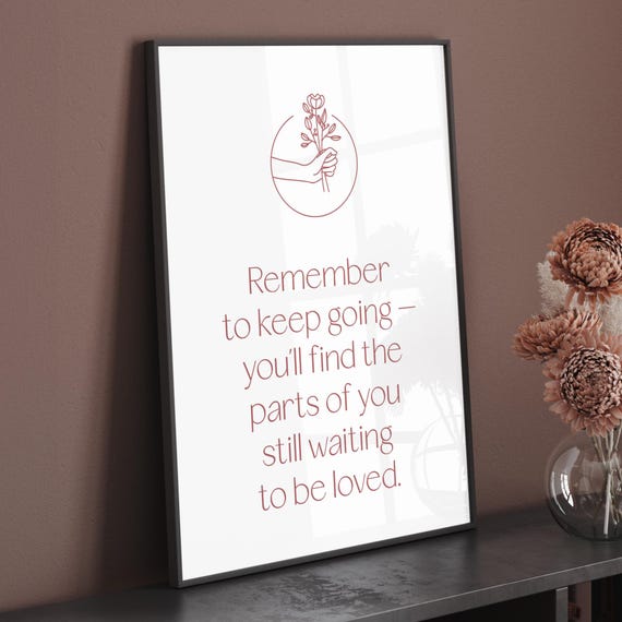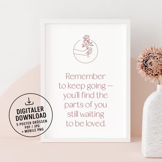 Dieses Achtsamkeitsposter im modernen Boho-Stil ist eine Einladung, dir selbst mit mehr Geduld, Weichheit und Mitgefühl zu begegnen. Die Botschaft „Remember to keep going — you’ll find the parts of you still waiting to be loved“ erinnert daran, dass Wachstum nicht laut, schnell oder perfekt sein muss. Viele unserer Antworten finden sich erst, wenn wir den Mut haben, weiterzugehen – auch dann, wenn wir uns noch unfertig fühlen.