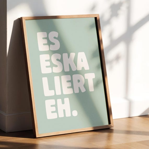 „Es eskaliert eh.“ – ein Spruch, der inzwischen Kultstatus hat und sofort für ein Schmunzeln sorgt. Dieses Typografie Poster bringt genau diese Leichtigkeit in deinen Alltag: humorvoll, ehrlich und mit einem herrlich entspannten Augenzwinkern. Der reduzierte Look mit der runden, weichen Schrift auf sanftem Grün macht das Motiv zu einem modernen Statement Poster, das überall dort passt, wo ein wenig Humor dringend gebraucht wird.