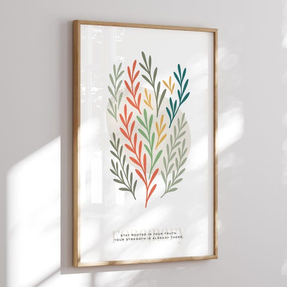 Inspiriert vom Duft und der Symbolik des Rosmarins steht dieses Motiv für Klarheit, Achtsamkeit und Selbstliebe. Es vereint die Ästhetik eines botanischen Blumen Wandbildes mit einem zarten Zitat als positiven Glaubenssatz – ein stiller Begleiter, der dich im Alltag an deine innere Stärke erinnert.