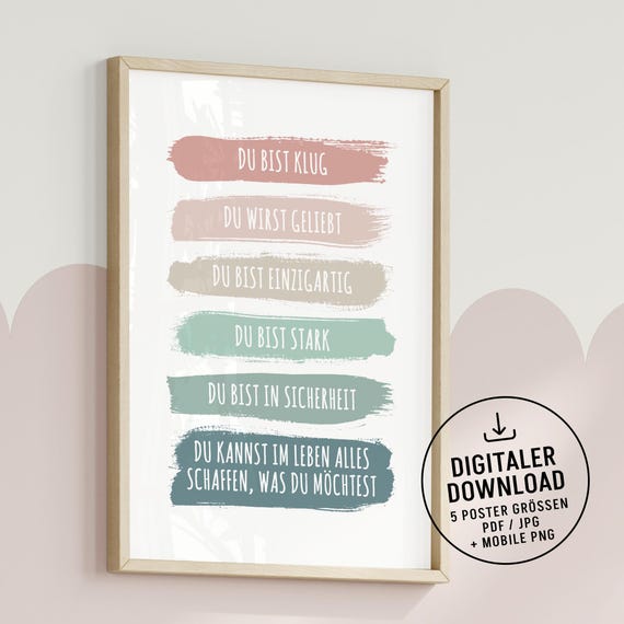 Dieses sanfte Affirmationsposter wurde gestaltet, um Kinder im Alltag zu stärken, ihnen Geborgenheit zu vermitteln und sie daran zu erinnern, wie wertvoll sie sind. Mit seinen zarten Brush-Strokes und kindgerechten Farben fügt es sich harmonisch in jedes moderne Kinderzimmer ein und eignet sich ideal als Geschenk zur Taufe, als Einschulung Geschenk oder als liebevolle Deko für Kindergartenräume.