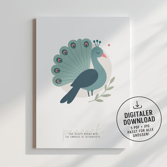 Soulful Birds Poster „Pfau“ – Boho Vogelbild mit Spruch zu Selbstliebe & Authentizität, achtsame Pfau Bilder für Schlafzimmer als Download by kleinbedrucktes